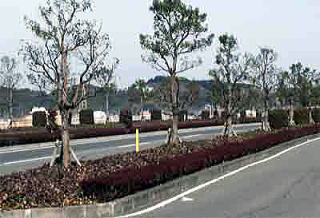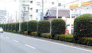 神宮駅前から北は、新しいバイパスですが、花ヶ島町付近は中央分離帯はサザンカとサツキ、左右歩道寄りはサザンカとクスノキとサツキの組み合わせとなっています。