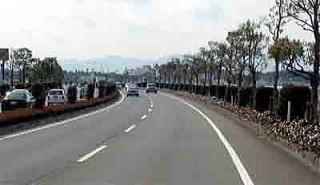 この路線は、中央分離帯のサザンカとその下のサツキの植え込みのみで、歩道寄りの左右には街路樹はありません。