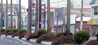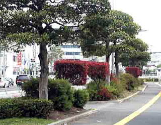 220号線バイパスに入り、さらに中村通りを南下すると、中央分離帯はワシントンヤシとソテツ、ハマヒサカキ、ツツジ類、左右歩道寄りにはクロガネモチという街路樹構成になります。