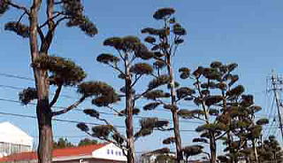 姿良く仕立てられ、駐車場を取り囲むように植えられていましたが、イヌマキと思った境界木は、イヌマキのほか、マツの園芸種と思われるものもかなり混ざっていました。同じ姿に仕立てられていたので、近寄らないと分かりません。