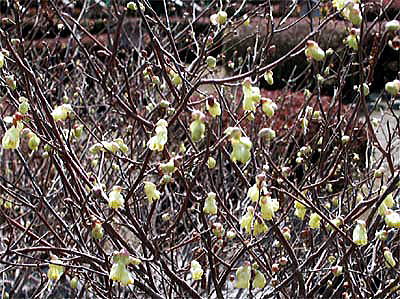 花は春、葉に先立って1〜3花が1〜2cmの穂のように垂れ下がります。