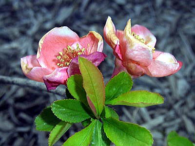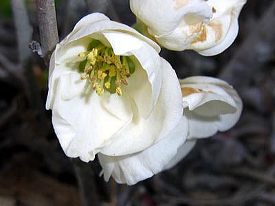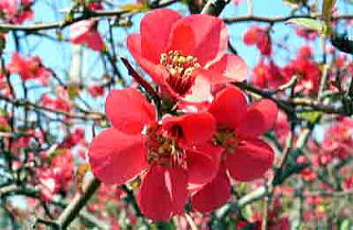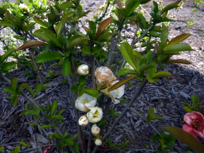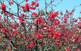 2011年春、県薬草・地域作物センターのボケの紅花と白花を撮影しましたので、写真を追加しました(3段目以降の5枚の写真)。