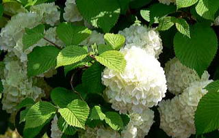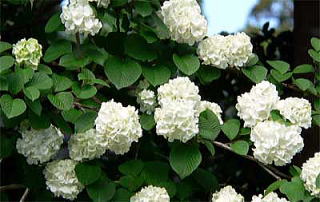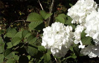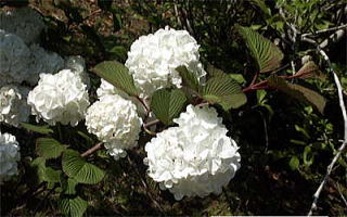 晩春、若枝の先に、5裂した花冠の装飾花ばかりを球形に開きます。