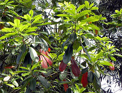 青島の県立亜熱帯植物園の入り口を入って、すぐ左側に、マテバシイのように大きい角質の葉で、しかも、鮮やかな赤い葉が混在している見慣れない木を見かけました。