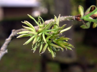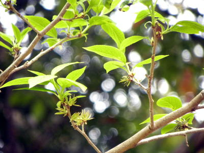 何気なく、一斉に小さな葉を出した若枝を見上げたところ、若枝の苞のわきに、薄緑色を帯びた花らしきものを見つけました。 花を観察するのは初めてです。