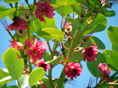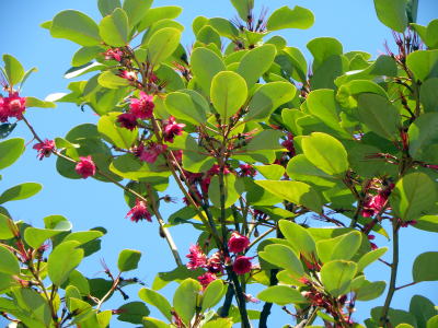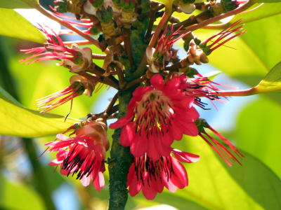 近寄ってみると、 やはり初めて見る樹木です。花の大半は散っていましたが、華やかな印象の深い紅色の花を下向きに咲かせていました。
