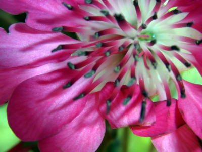 紅色の花弁状の総苞片は、15〜20枚。総苞片の中央に雄しべや雌しべがかたまっている。