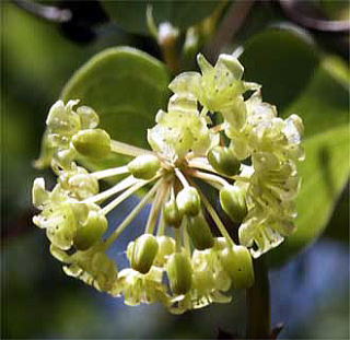 葉は、丈夫な革質で光沢があり、モチを包むときに使い、また、赤色の果実が綺麗なので、馴染みの多い植物だと思いますが、花は滅多にお目にかからないのではないでしょうか。