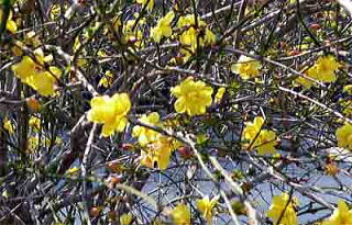 オウバイは落葉樹で葉に先だって花をつけ、ウンナンオウバイは常緑ですから、花の時期にも前年の葉がたくさんついています。