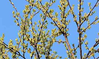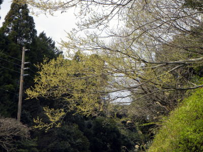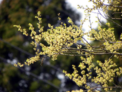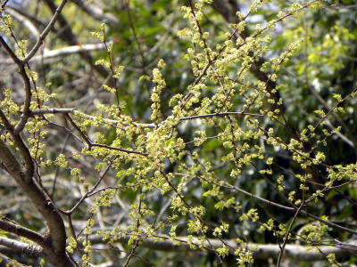 なお、新芽と花がつき始めたエノキは、遠目には最下段の写真のように、一見アオモジやシロモジの花かと思う黄色い集合花のような姿をしています。