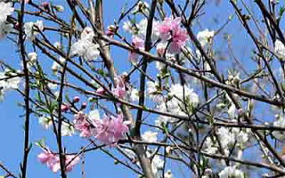 ハナモモの一種だと思いますが、同じ木に、白花と赤花が同時に咲きます。
