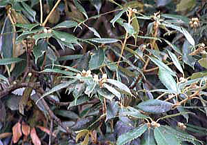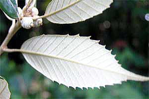 葉は互生、長さ5〜15cm、裏面は葉柄や若枝と同じく、黄褐色の星状軟短毛を密生します。