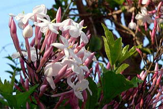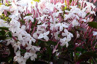 ジャスミンは、アジアからアフリカの熱帯あるいは亜熱帯地方の原産で、ほとんどの種は、白または黄色の花を咲かせるそうです。