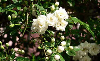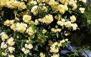 花は晩春、若葉とともに開き、黄色または白色の八重咲きで、花は多数つきます。