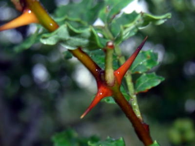 高さ1〜3m、枝や葉の基部に1対のとげがあります。