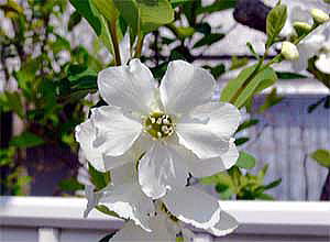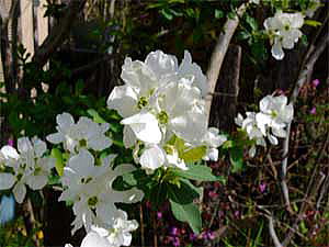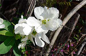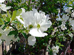 遠目には白梅か、シロバナボケのようでしたが、近寄って見ると、花はやや大型で、中央部に雄しべが集まって緑色の芯をつくっており、全く別種でした。
