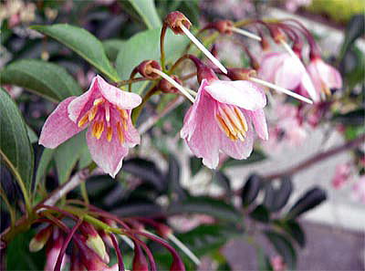 花は、下向きに枝からつり下がる独特の咲き方です。