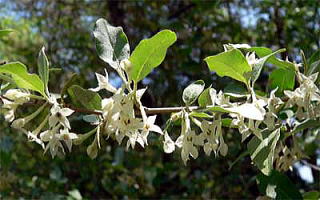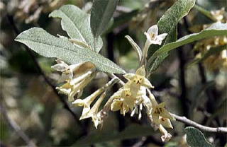 葉は互生し、長さ5cm位,銀白色の星状鱗片を密生。 花は初夏,がく筒の長さ6mm位,白から黄色に変わり,銀白色の鱗片におおわれる。