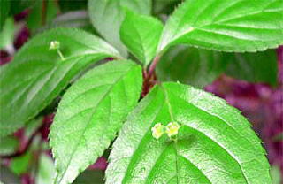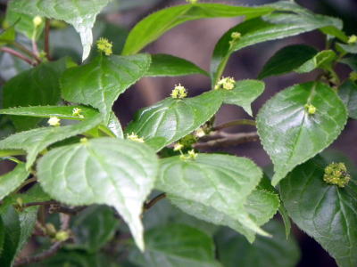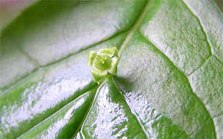 花は初夏、葉面の中ほどに短柄をつけ、雄花は数個集まって咲き、雌花は通常1個、まれに2〜3個つきます。