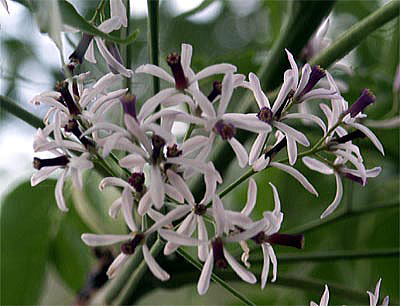 花は初夏、若枝の葉えきに7〜15cmの花序をつけます。 小さく地味な印象の花ですが、よく見ると大変美しい花です。
