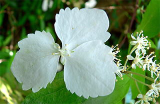 コガクウツギの装飾花は、3〜5個、大小がありますが、ガクウツギの装飾花は、普通 3個、または3個が大きいとされています。