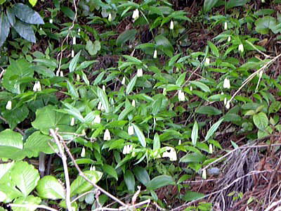 2010年の春、初めて訪ねた延岡市の家田湿原添いの茂みの中で、びっしりと群生しているホウチャクソウを見かけましたので、写真を追加しました(5段目の2枚の写真)。