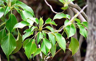 輪状に分枝し、葉は、長柄があり、革質で光沢があります。 写真に見るように、葉のつきかたが車輪状という特徴があります。