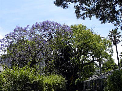 開花し始めたジャカランダの大木と並んで、青島亜熱帯植物園のギンネムの大木が、丸い白や黄色の奇麗な花を咲かせていました。