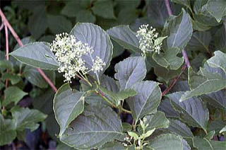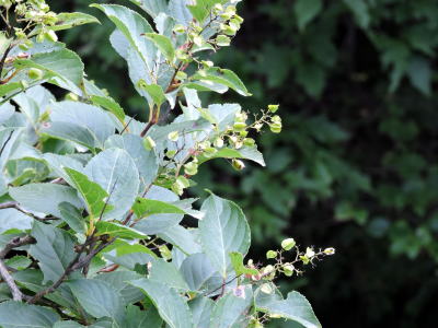 枝は赤褐色を帯び、葉は互生、縁に細かな鋸歯があります。