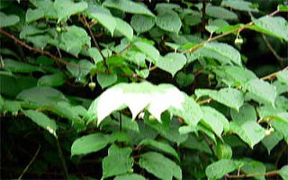 マタタビの果実は、昨年(04年)7月に撮りましたが、花の写真は撮り損ないましたので、今年は、葉が白くなるのを待って(花期には葉が白くなります)、花を探しました。