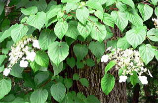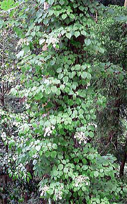 山地に生える落葉つる低木、気根を出してほかの樹木や岩に這い上がります。