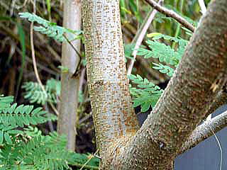 葉は互生し、偶数2回羽状複葉,長さ15〜25cm。6〜8対の羽片があり,各羽片は10〜16対の小葉に分かれる。