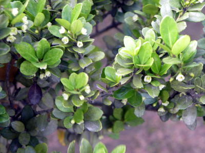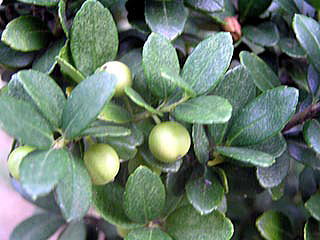 葉は、長さ1.5〜3cm,革質で表面は光沢があり,裏面に腺点がある。