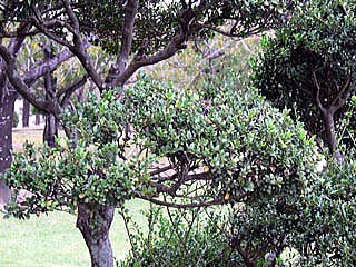 マメツゲ及びその母種のイヌツゲは、剪定によって、好きな樹形に仕立てることが容易なためでしょうか、公園や庭園に多く植えられています。