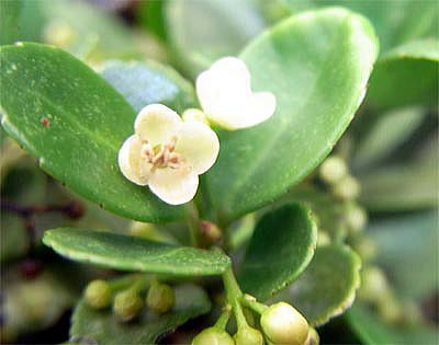 葉は長さ1.5〜3cm,革質で表面は光沢があり,裏面に腺点がある。 雌雄異株。花は初夏,花弁とがく片は各4枚,雄花は、前年または若枝の葉えきに短い花序をつくり,雄しべ4本と退化した雌しべをもつ。雌花は、若枝のわきに1花ずつつける。