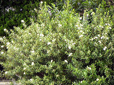 宮崎市内を散策中、街路の植え込みの低木に、白い美しい花がたくさん咲いていることに気付きました。