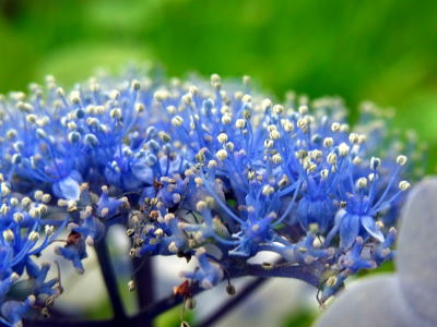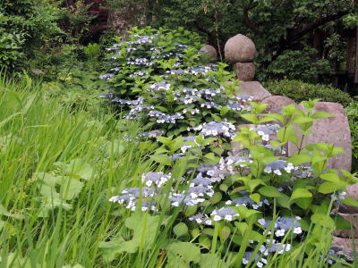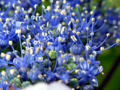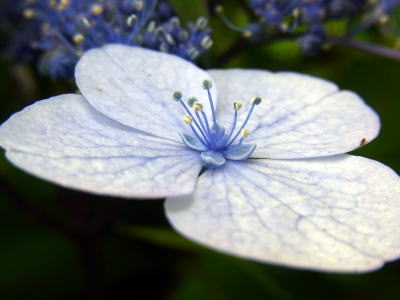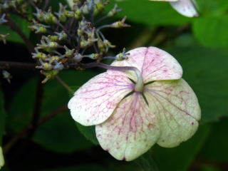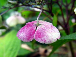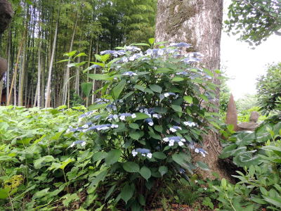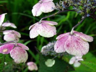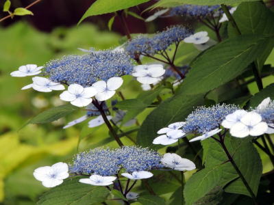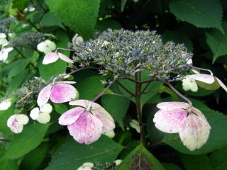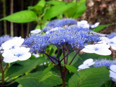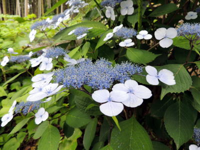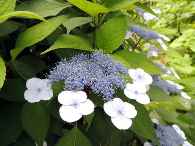 青色の両性花の周囲に、淡い青色の装飾花をつけていますが、コアマチャの装飾花は、のちに紅色になるそうですので、今後観察を続けたいと思います。