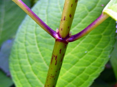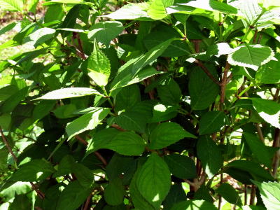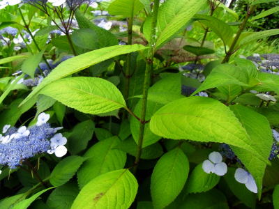 茎も葉も、アジサイによく似た印象ですが、葉はアジサイに比べるとかなり細身な印象です。