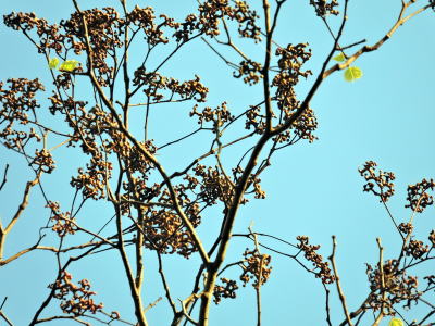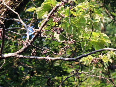 高木ですので、撮影に苦労しましたが、枝に残った葉とともにユニークな形をした果実(果柄、種子)の様子を何とか撮影することができました。
