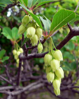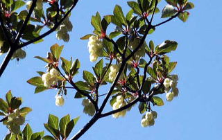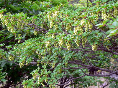 白花といえば、普通のドウダンツツジですが、ドウダンツツジが散形花序で、1〜数個の花を下垂するのに対し、ベニドウダンは総状花序ですから、花は数個縦につながって長く見えます。
