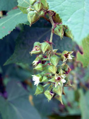 花期は、秋から初冬といいますが、翌2016年は、8月末に早くも枝先からぶら下がるように咲いている白い円錐花序を見かけました(3段目右側~5段目の5枚の写真)。