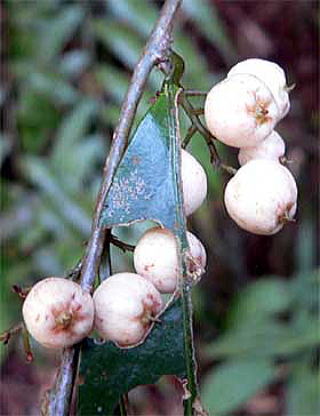 果実は球状で、径5mm位、残存する花冠に包まれ、白色です。