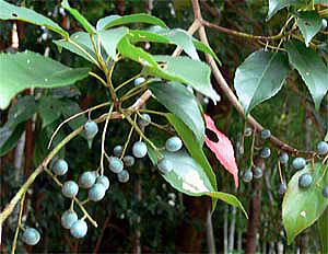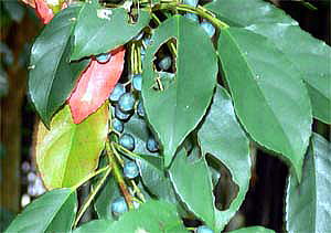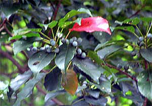 2008年に、濃藍色に熟したコバンモチの果実を国富町の法華岳公園で、間近に観察することができましたので、 写真を追加しました(4〜5段目の4枚の写真)。