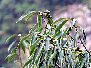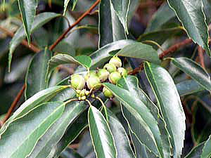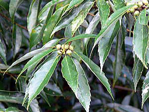 葉は、互生,長さ7〜15cmで薄い革質,表面はつやがあり,裏面は蝋質を分泌し白色。