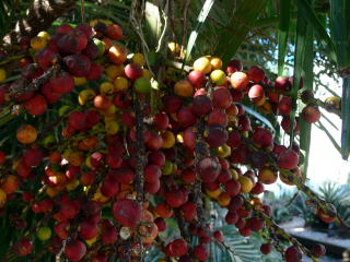 クロツグのツグは、シュロを意味し、木全体が黒い繊維で覆われ、黒っぽい感じがするので、クロツグと名付けられたそうです。 一本の柄の周囲に、赤や黄色、緑色などバラエティーに富んだ沢山のビー玉状の果実をつけます。