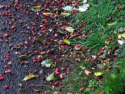 数多くの果実がついたマルバグミの枝の下は、辺り一面、落果した赤い果実で敷き詰められているようでした。