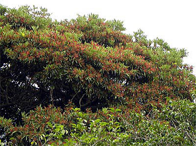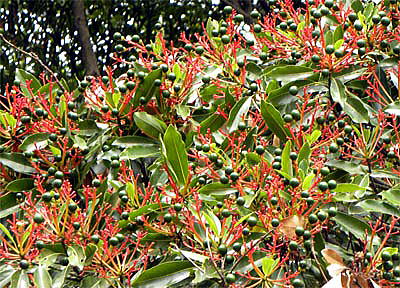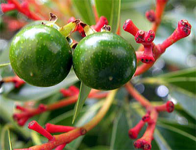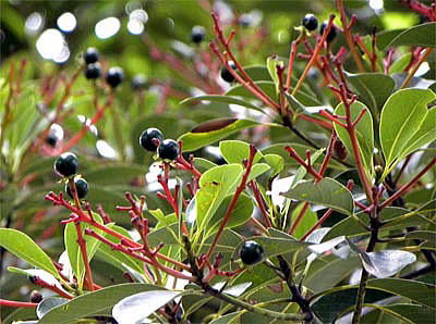 タブノキは、早春、特徴のある花序の目立つ木ですが、初夏には、赤い果枝と緑色に輝く丸い果実が遠い所からもよく目立ち、驚くほど美しい姿を見せる木です。