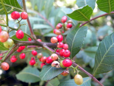 2011年秋、青い液果を多数穂状につけているのを観察したのですが(4段目左側の写真)、名前が分からず、植物園の担当の方に教えていただき、サンショウモドキと分かりました。