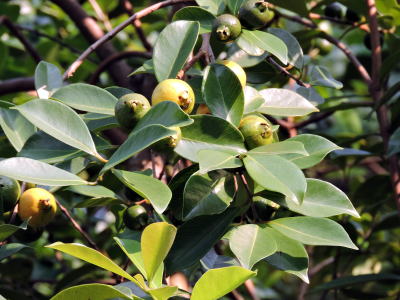 淡い黄白色の花は、【野菜・果物類の花】 のページに掲載しましたが、やや丸っこい緑色の果実をたくさんつけていたので、撮影しました。