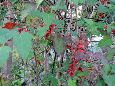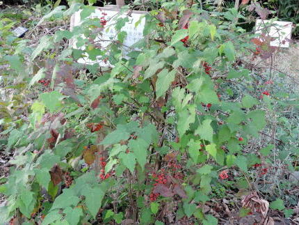 2016年秋、温暖な日が続いていましたが、11月上旬になり、茎から赤い果実をつけた果序がいくつもぶら下がっているのに気付き、慌ててその様子を撮影しました。